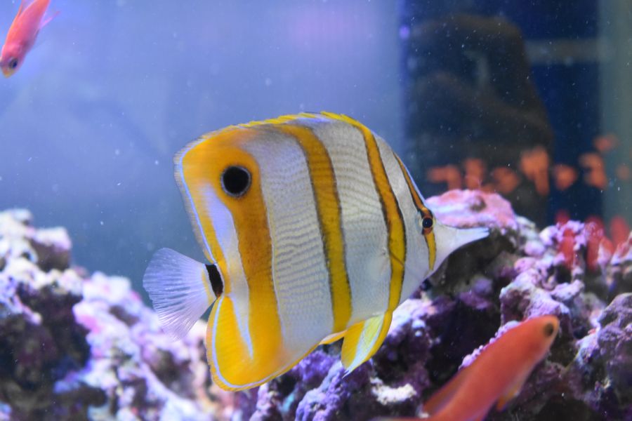 黄色と白のバンド模様に、細長い吻をもつチョウチョウウオの仲間です!