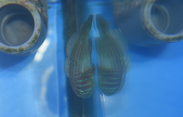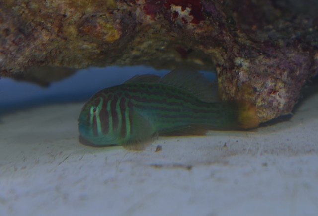 緑を基調に赤いラインとスポットの入る、ユニークな外見の小型ハゼになります!