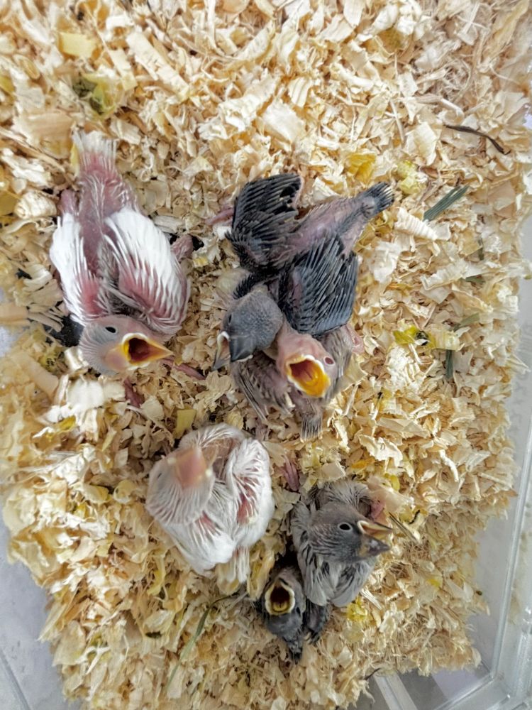 桜文鳥2羽、白文鳥2羽、シナモン文鳥1羽、シルバー文鳥1羽