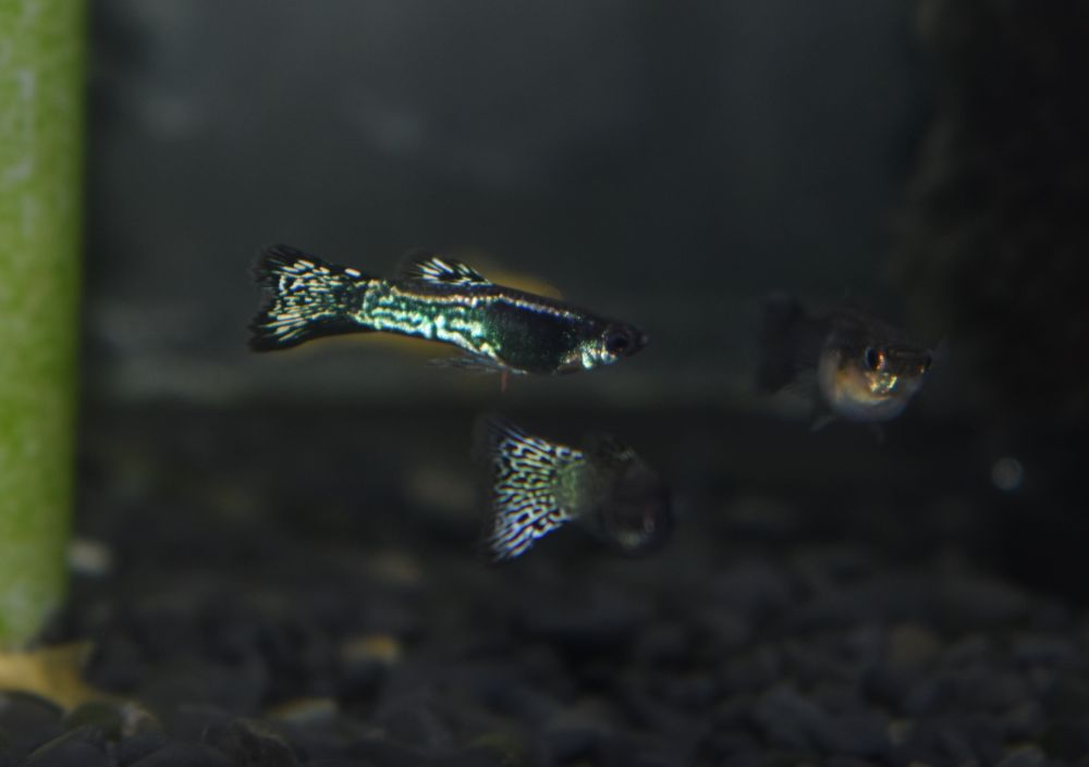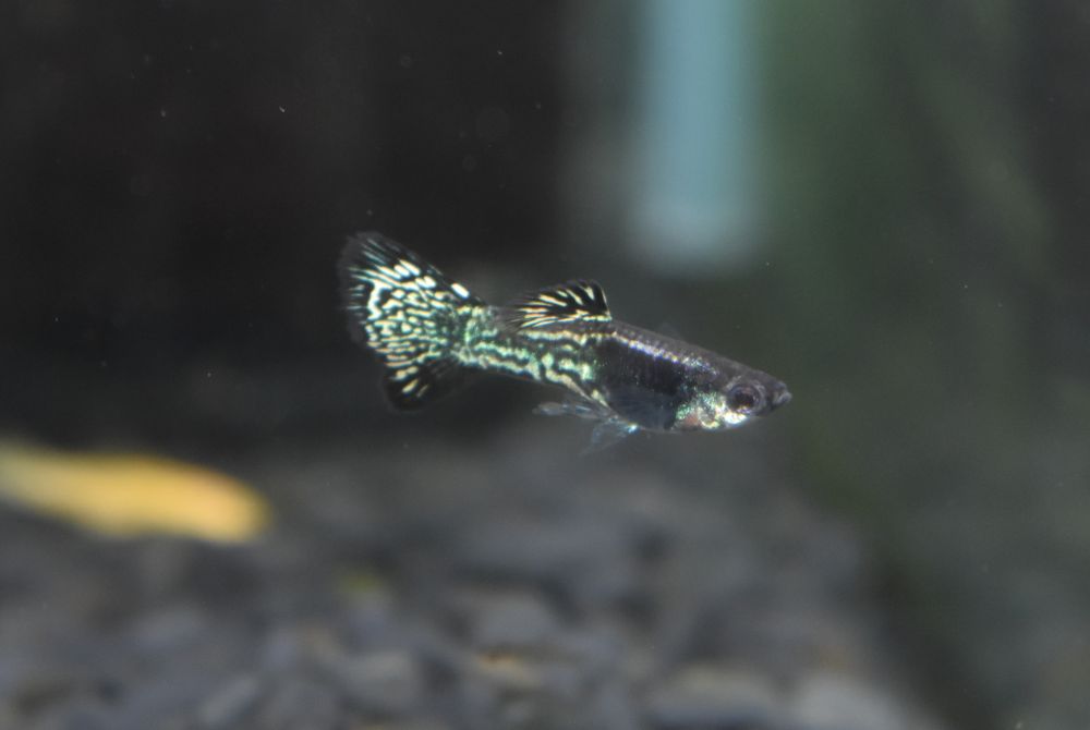 深い黒を基調に、金属光沢とレース模様が組み合わさった高級改良グッピー!
