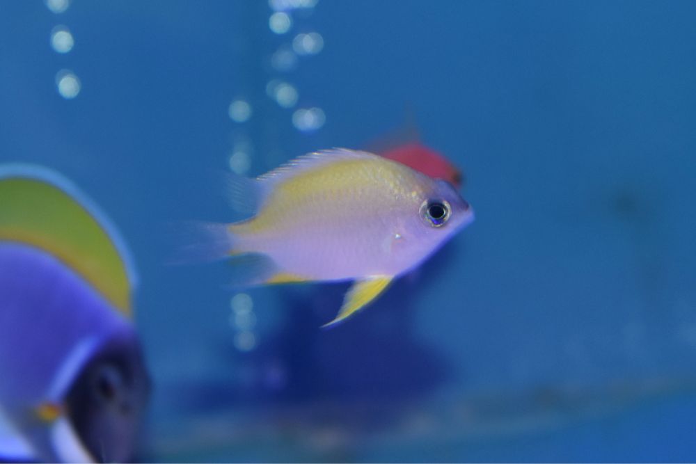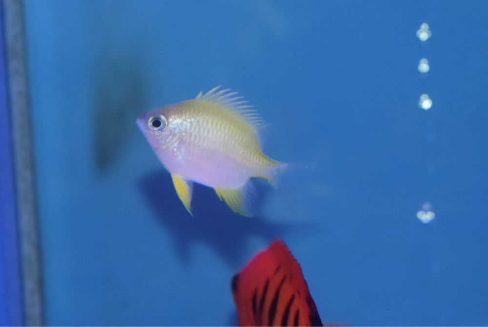 黄色い口元と銀白色の体色が美しいスズメダイの仲間^^