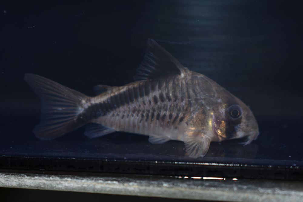 アイバンドを持ち、背ビレから尾にかけて斜めのバンド模様を持つかっこいいコリドラスです!