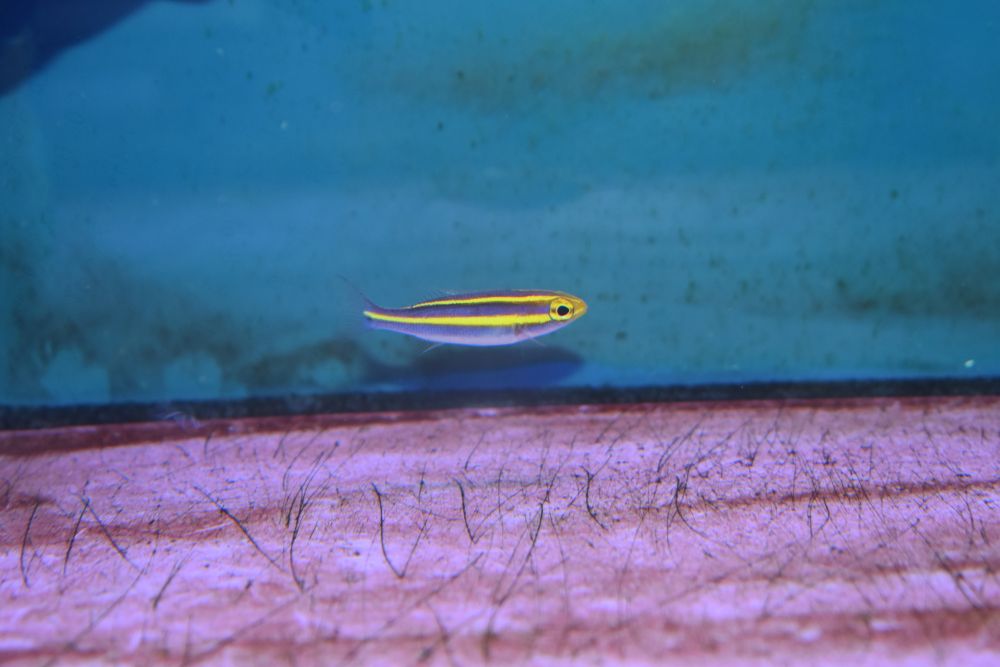 青っぽい体色に黄色のラインが美しく入り目立つお魚です!