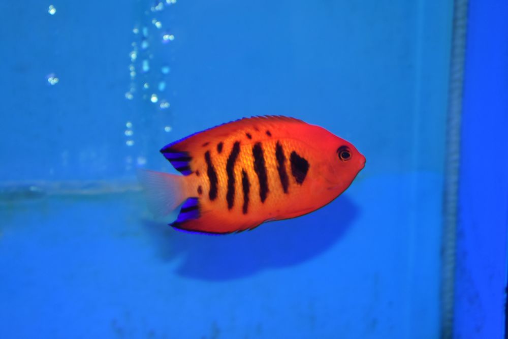 燃えるような赤い体色と黒い縦帯が特徴の海水魚で、