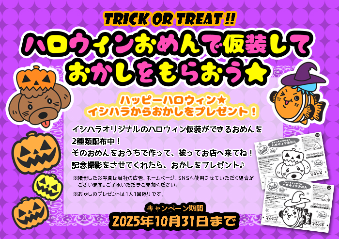 イシハラオリジナルのハロウィン仮装ができるおめんを、